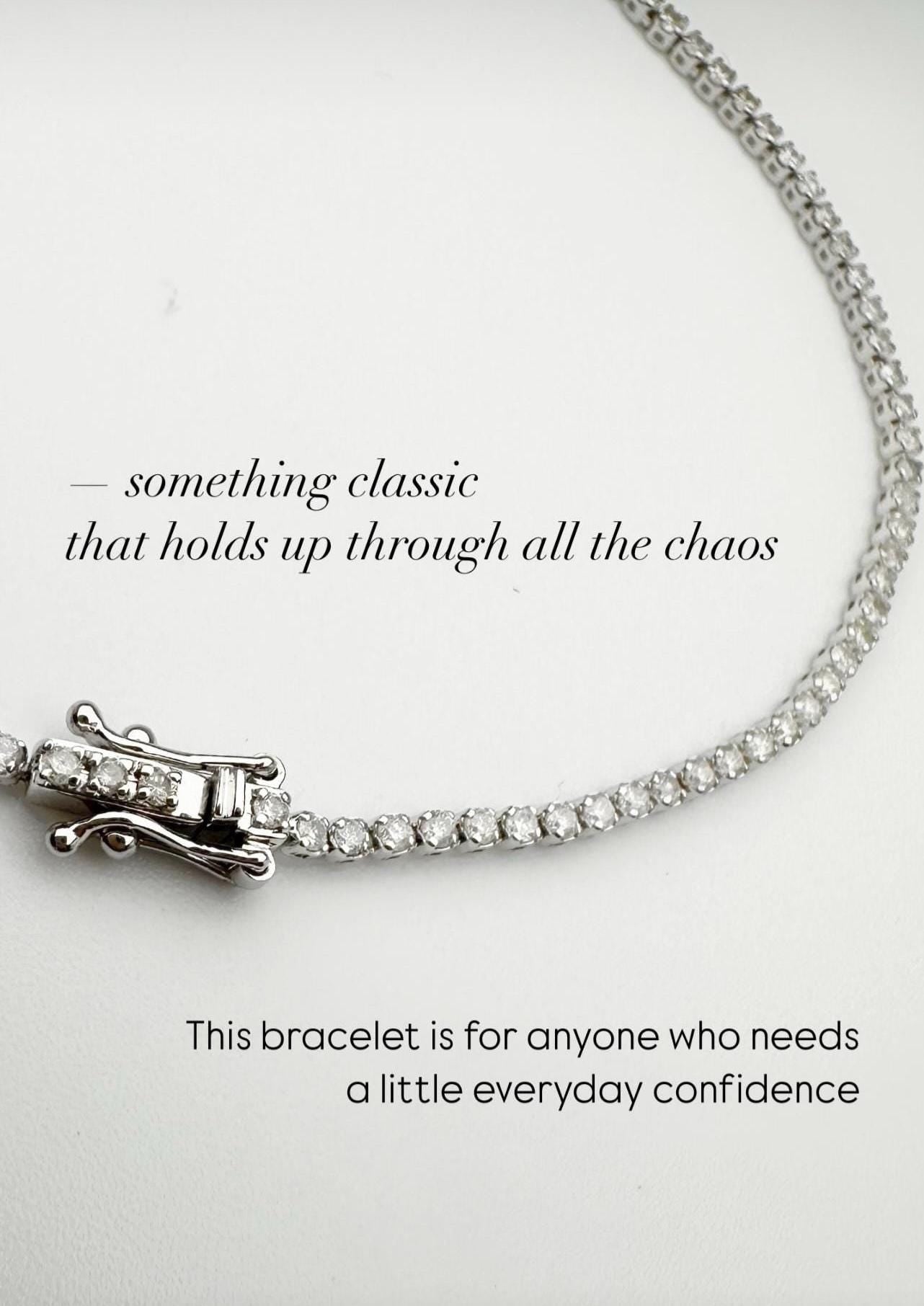 This 18K solid gold diamond tennis bracelet features 1 total carats of natural diamonds, selected for their clarity and brilliance. Designed with a lightweight, dainty profile and secured with a triple-lock clasp, it’s made to move effortlessly from day to night.