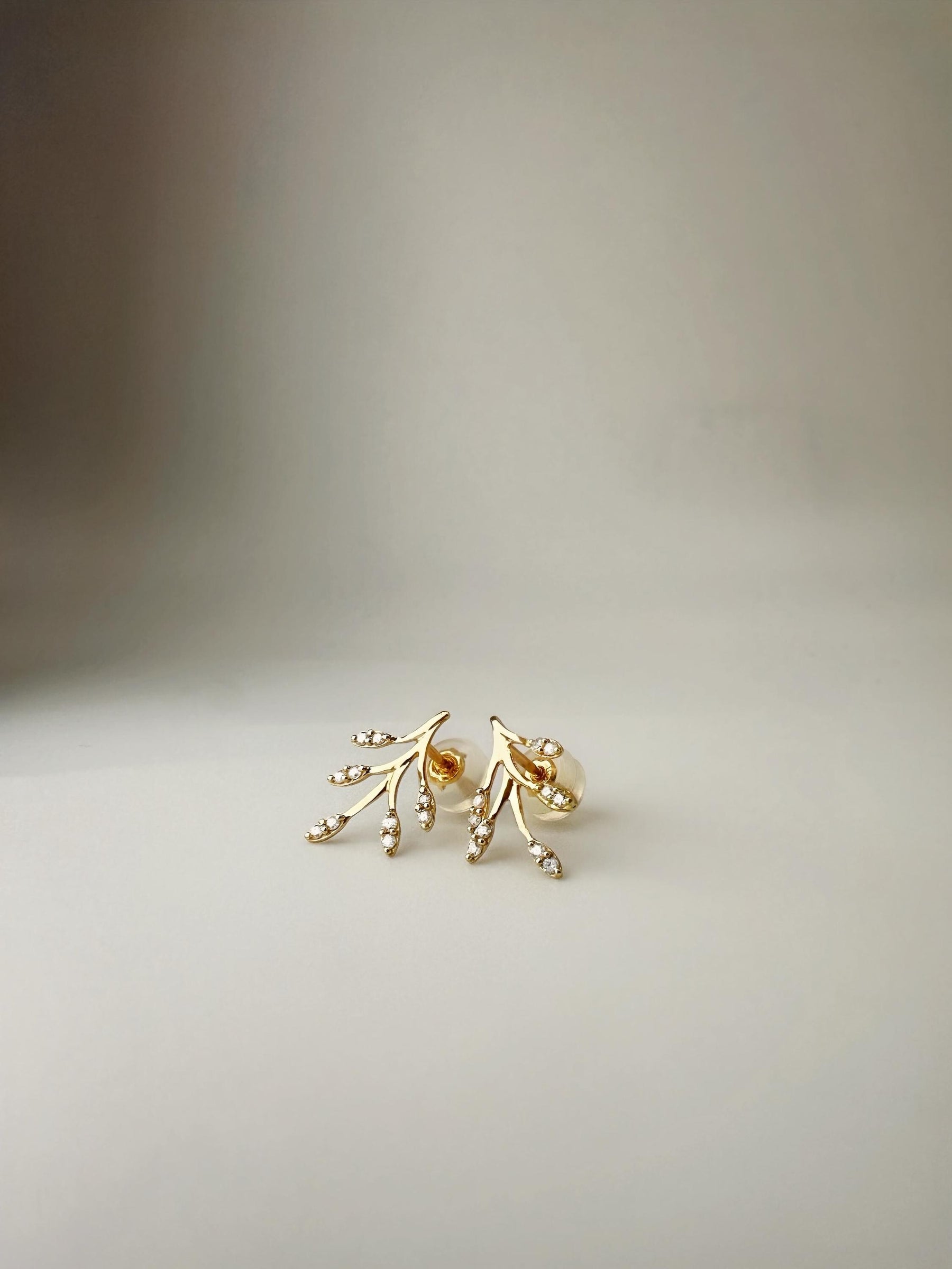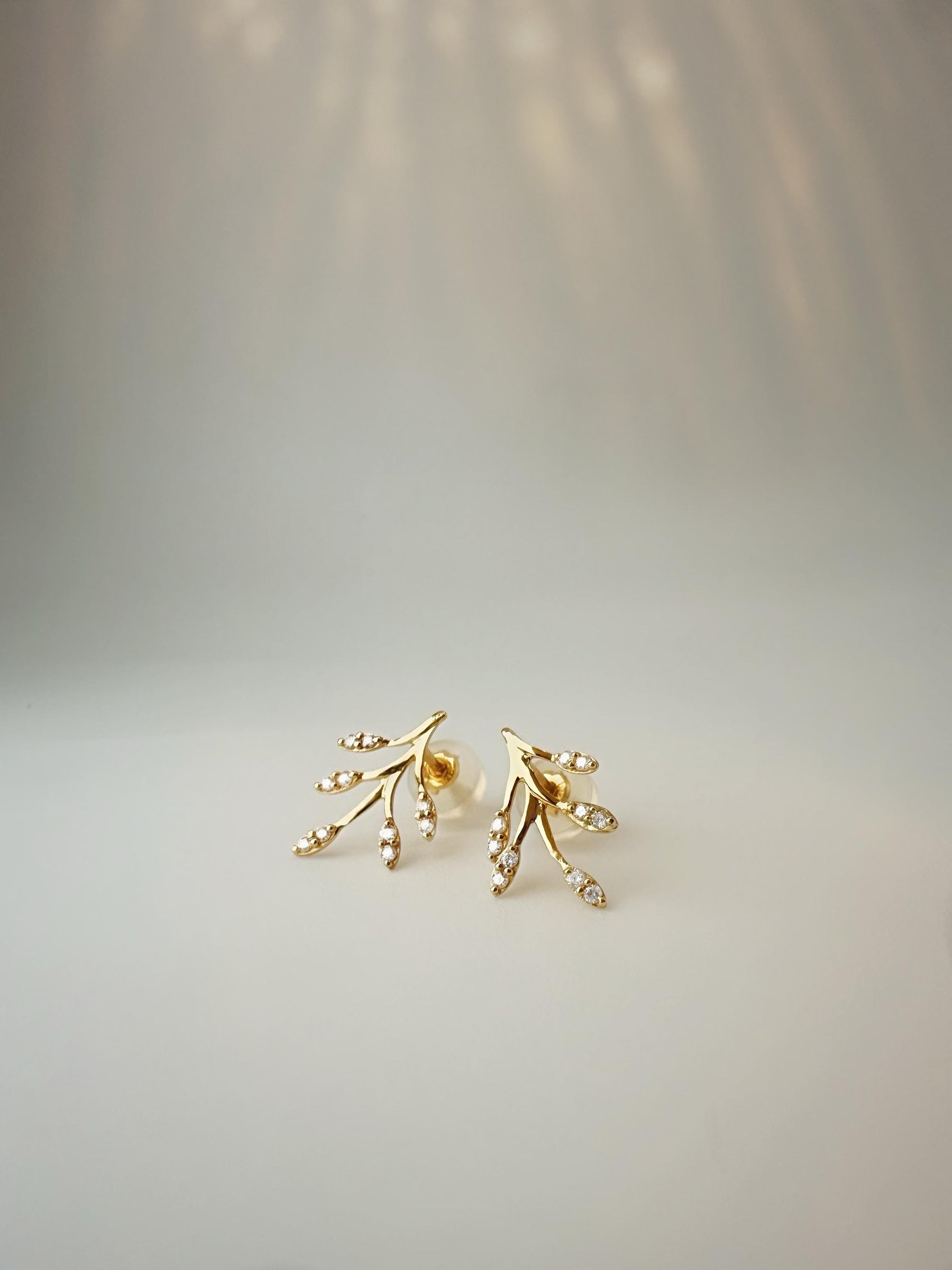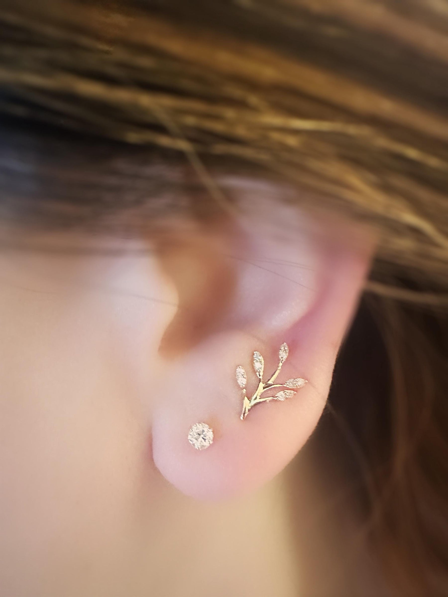These 18K solid gold olive leaf diamond climber earrings are set with natural diamonds selected for VS clarity and colorless D–F range. The graceful leaf motif curves gently along the ear, creating a refined climber silhouette that feels organic, elegant, and quietly luminous.