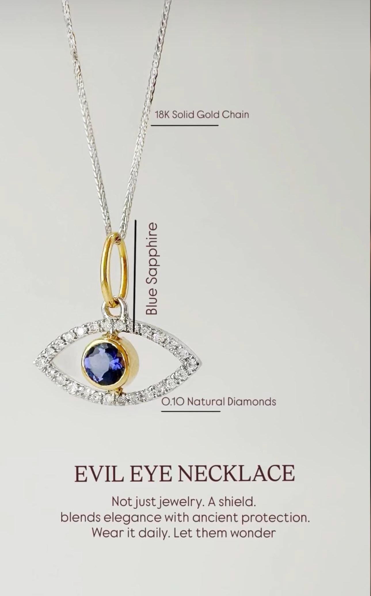 This 18K solid gold evil eye necklace features natural VS-clarity diamonds surrounding a vivid blue sapphire center, creating a timeless symbol of protection with refined sparkle. Finished in a subtle two-tone design and paired with a delicate tauco chain, it rests effortlessly at the neckline — light, meaningful, and easy to wear every day.