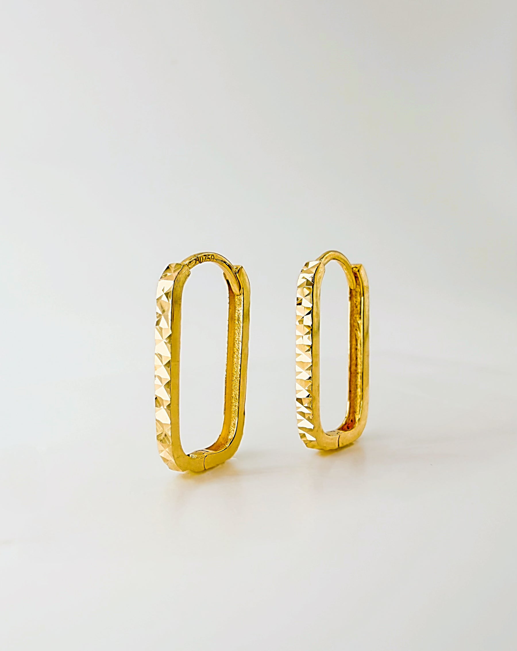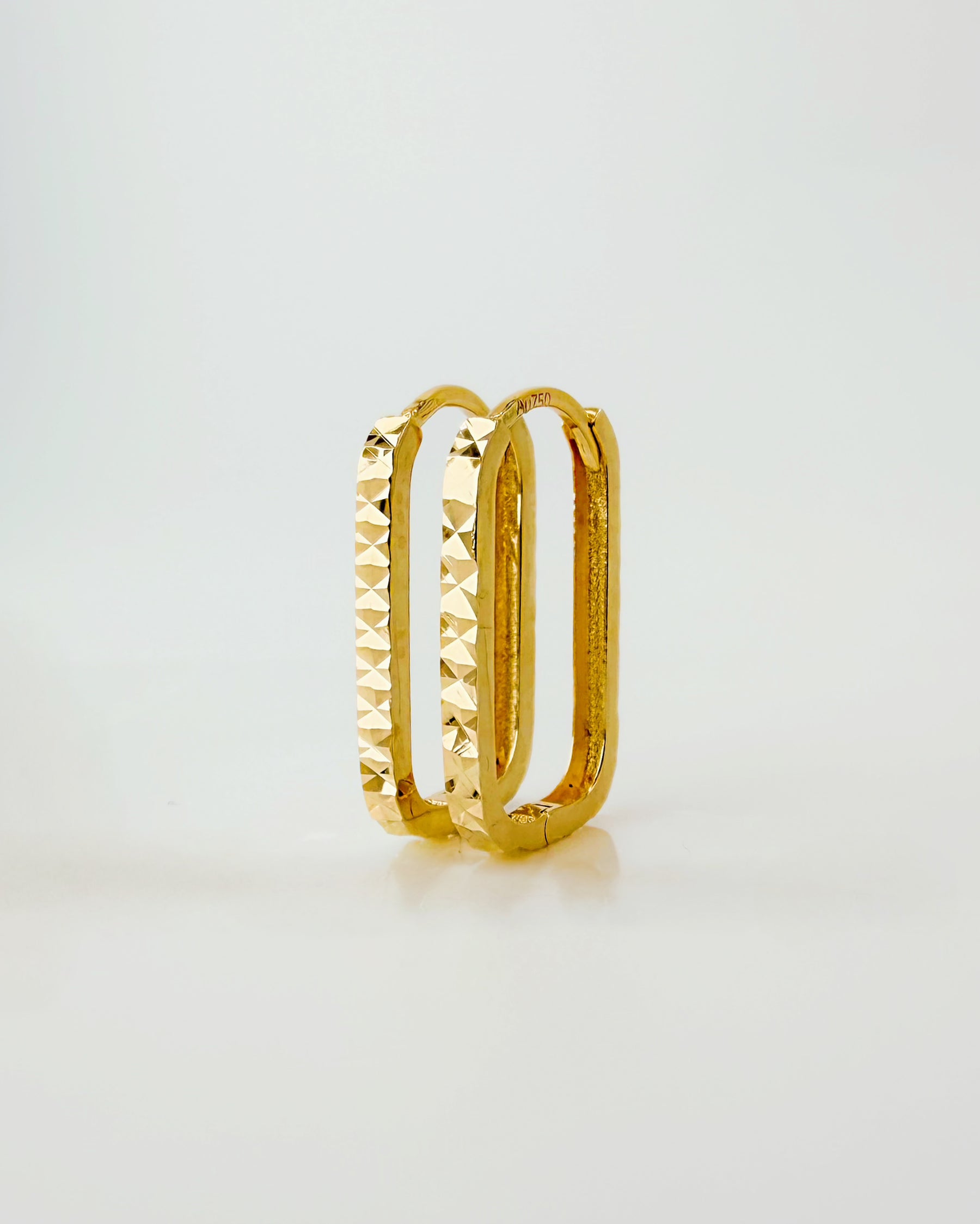 These 18K solid gold paperclip huggie earrings feature a sleek rectangular silhouette finished with subtle faceted texture that catches the light effortlessly. Lightweight and architectural, they offer a fresh alternative to classic round hoops — minimal, polished, and designed for everyday wear.